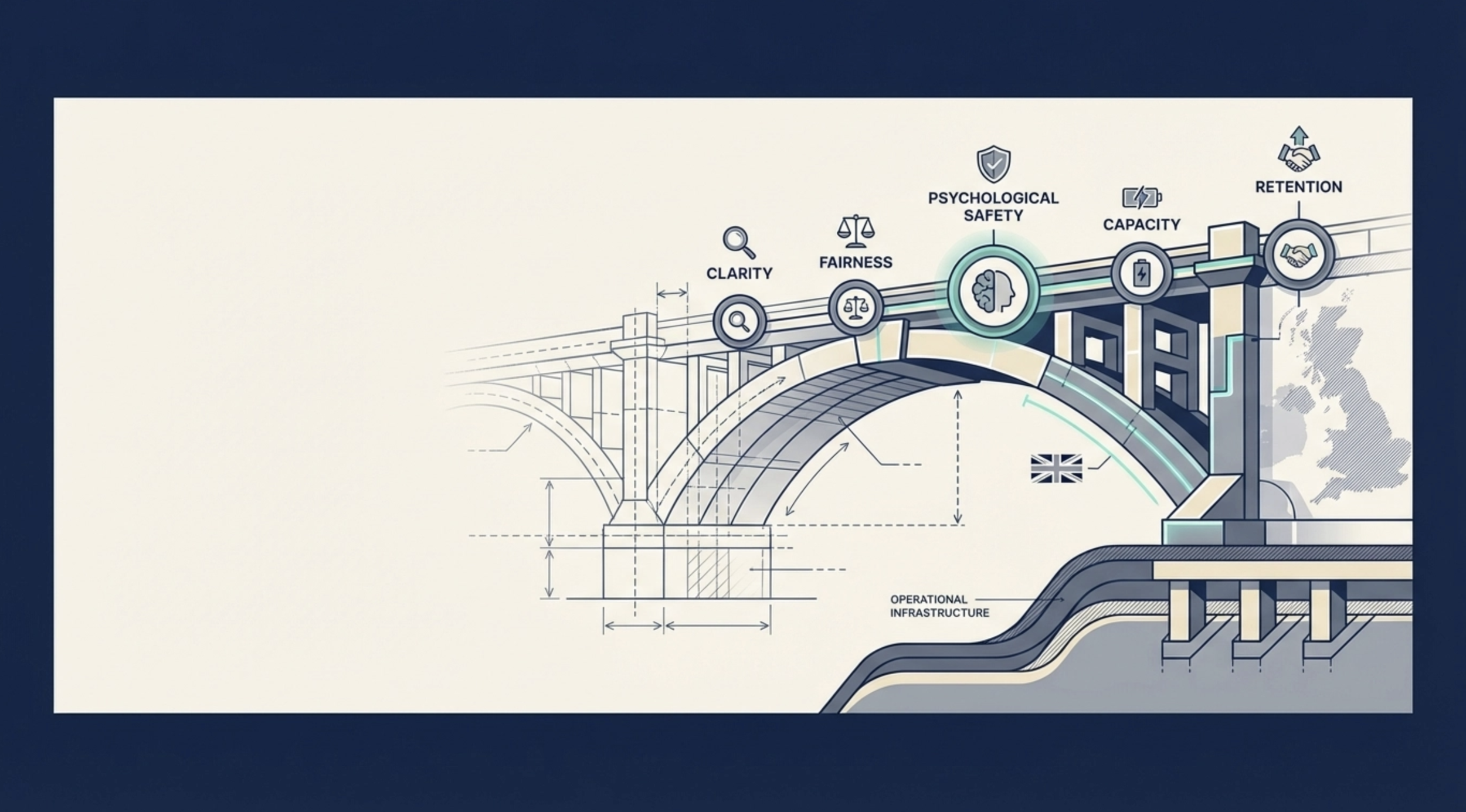 Alt text: Blueprint-style bridge illustration showing compassionate leadership and psychological safety as operational infrastructure supporting employee retention in the UK.